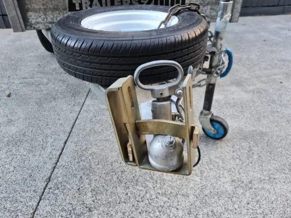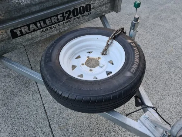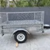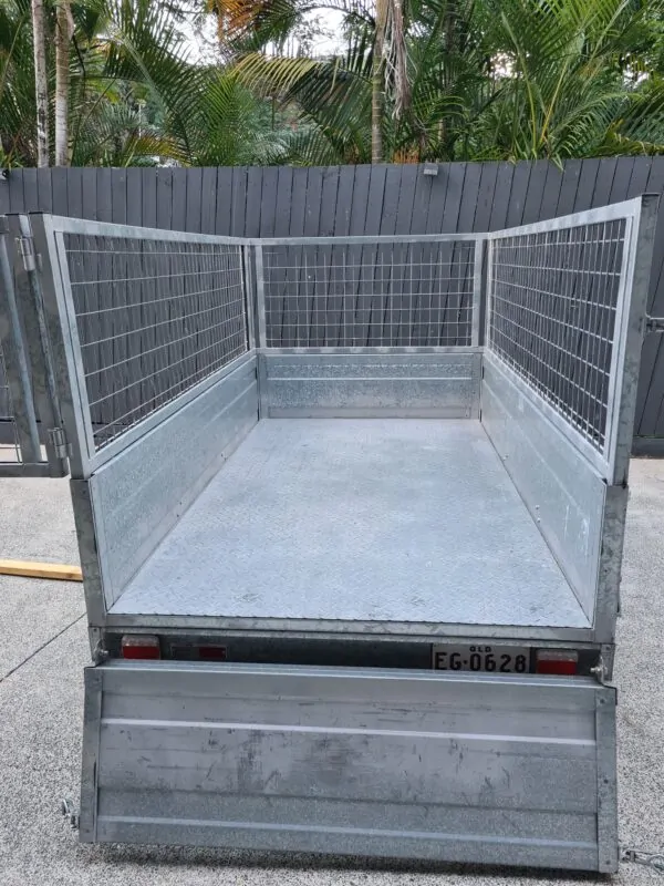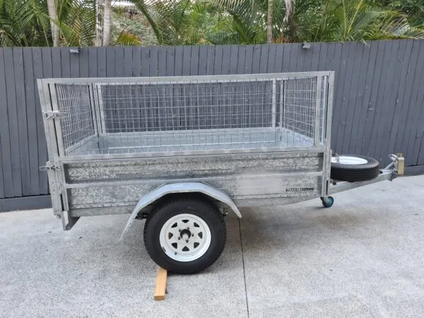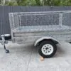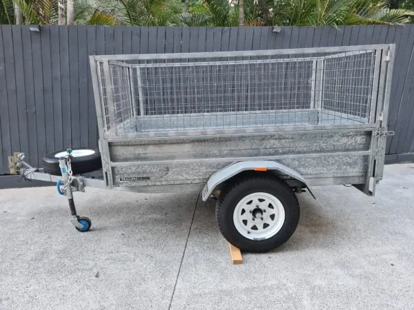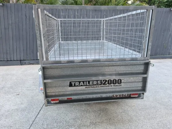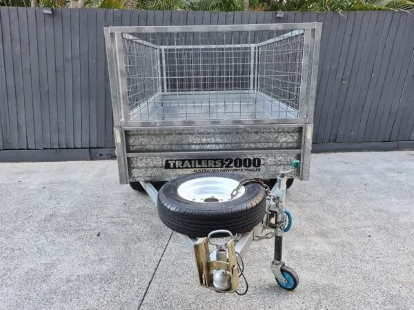 Features: 7×4 box trailer, hot dipped galvanised, cage with rear drop gate, tie rails all round, swing-up jockey wheel, spare wheel, genuine Trailers 2000 build.